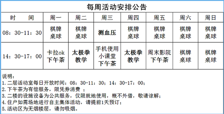 针对老人的生活习惯和喜好,设计具有典雅大堂、餐厅、桌球、乒乓球、健身器材、舞蹈室、公用洗衣机、公用冰箱、茶吧及会务厅等,配备齐全,为老人提供全方位、高质量的休闲娱乐服务设施和场所。